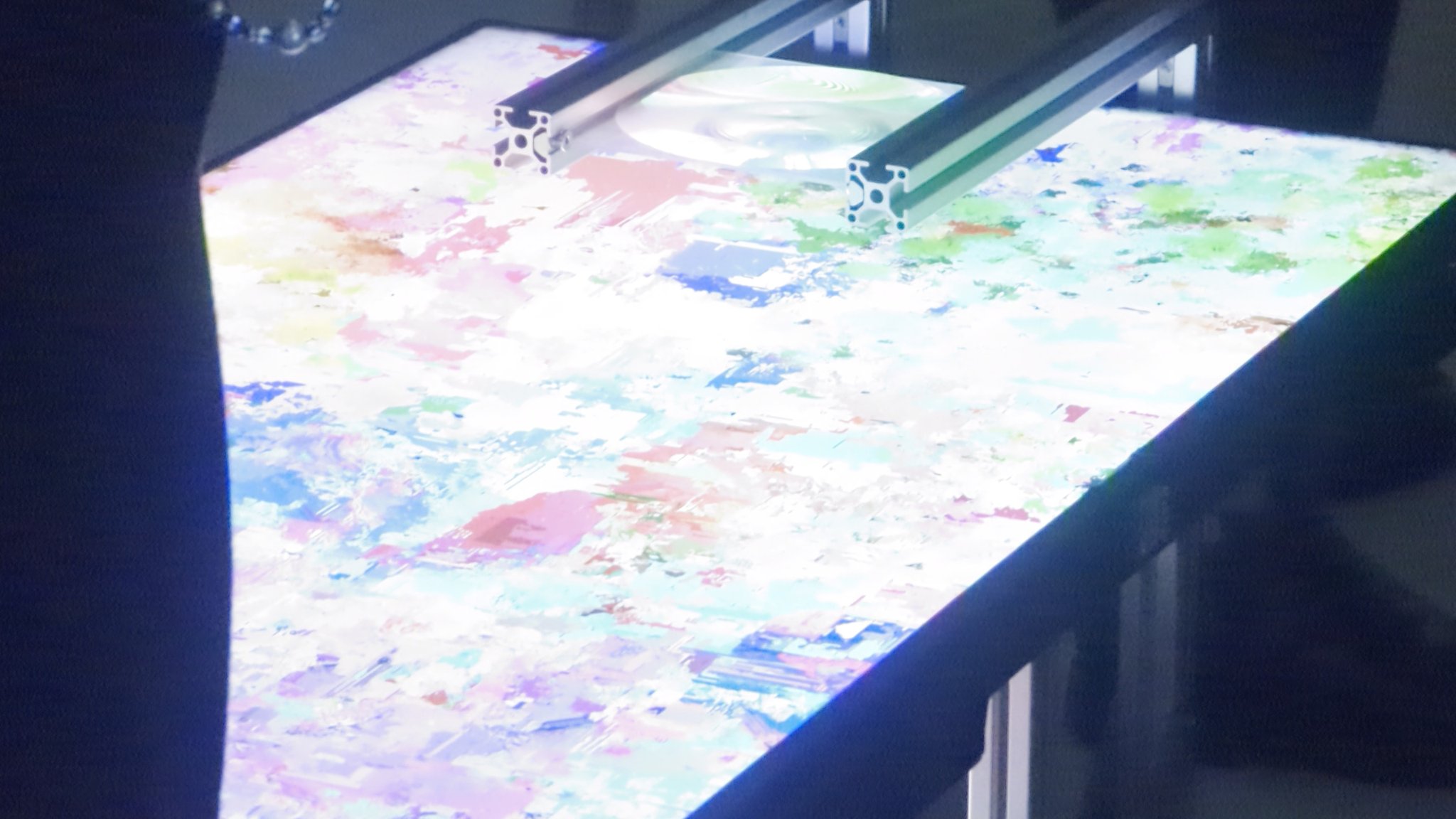 A physical lens magnifies a portion of the display so viewers can isolate and observe a local region within the overall flow. A camera senses nearby human activity and feeds that signal back into the automaton to bias its rule dynamics: stronger activity favors faster, anisotropic "artificial" behaviors, while low activity allows slower, more isotropic "natural" behaviors to surface. As viewers lean in or the space becomes restless, observation itself becomes an environmental force. It resonates with the way local interactions cascade through social, informational, and ecological networks, where we are always already involved. To encounter a quieter, more "natural" state, one must still the body and calm the space.