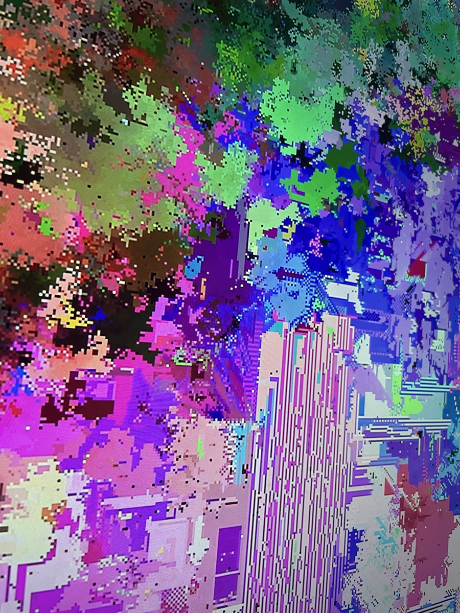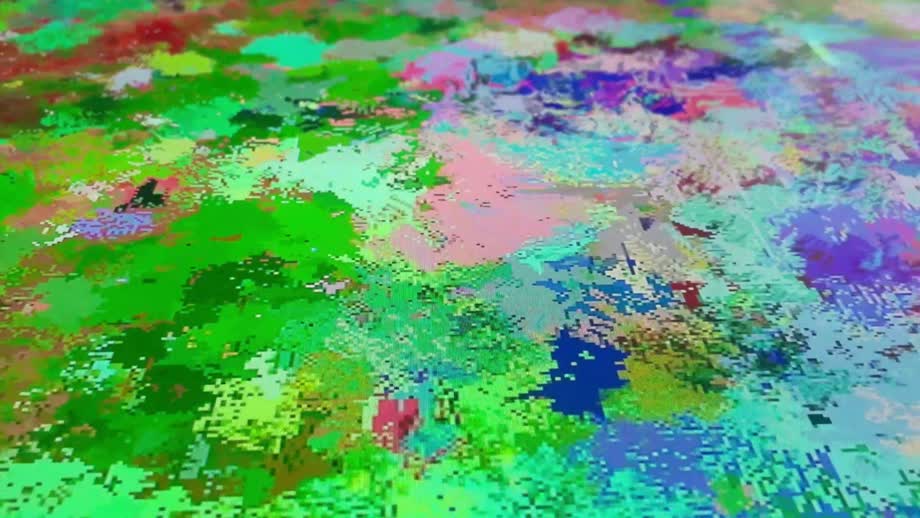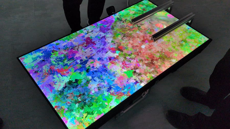 A cellular automaton is a grid-based system in which each cell updates from its neighbors, showing how simple local rules can yield complex behavior. Mutual Field runs an artist-designed, multi-species cellular automaton in real time: different colors function as different species, each with its own rules, producing ongoing cycles of reproduction, coexistence, and elimination as patterns continually form and dissolve.