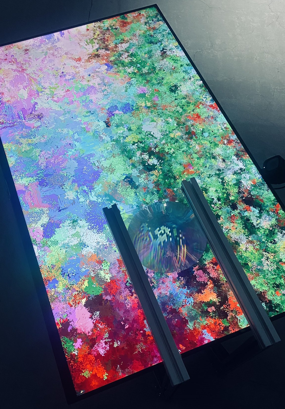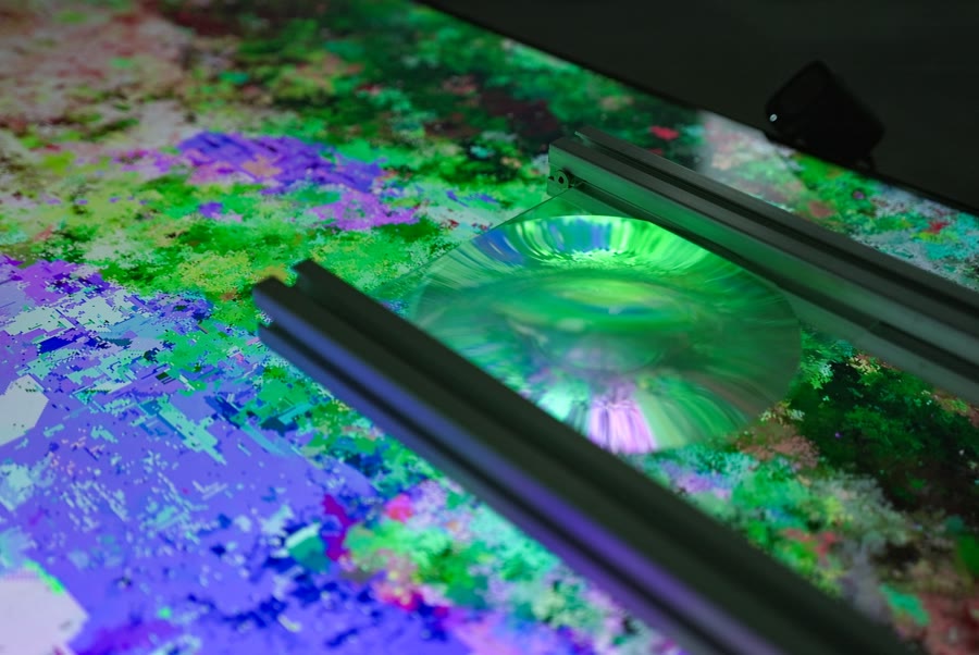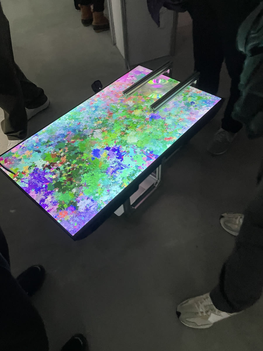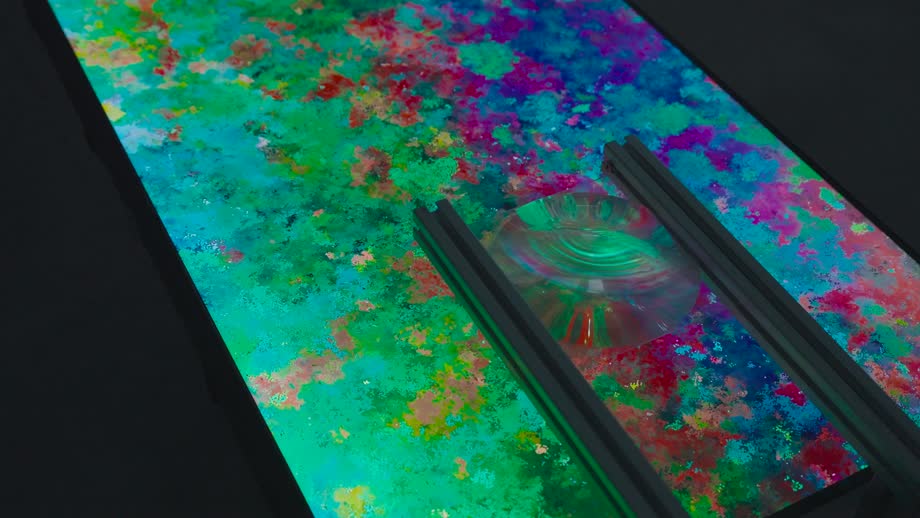 A physical lens magnifies a portion of the display so viewers can isolate and observe a local region within the overall flow. A camera senses nearby human activity and feeds that signal back into the automaton to bias its rule dynamics: stronger activity favors faster, anisotropic "artificial" behaviors, while low activity allows slower, more isotropic "natural" behaviors to surface. As viewers lean in or the space becomes restless, observation itself becomes an environmental force. It resonates with the way local interactions cascade through social, informational, and ecological networks, where we are always already involved. To encounter a quieter, more "natural" state, one must still the body and calm the space.